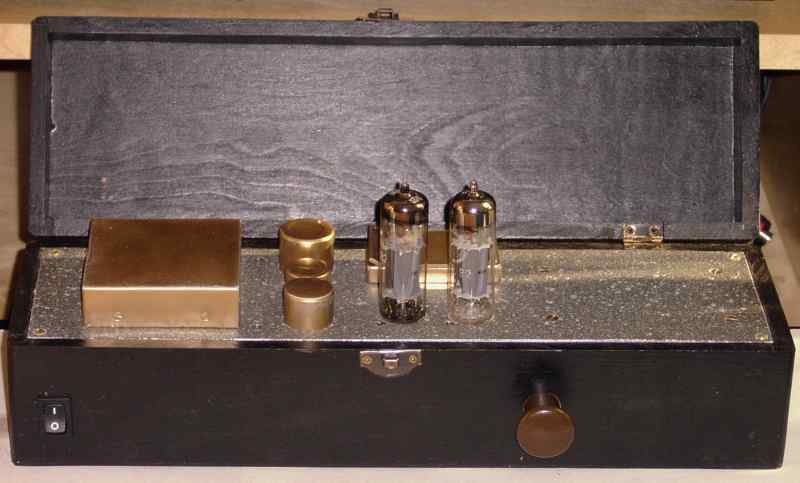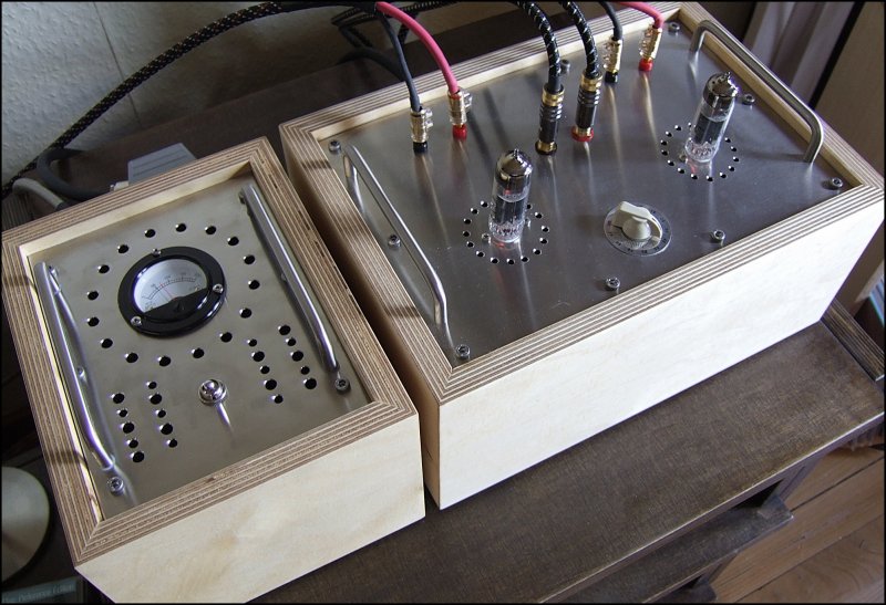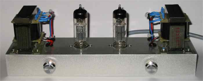 Einleitung Diese kleine "Verstärkerchen" ist der Beweise dafür das Röhrentechnik auch kompakt aufgebaut werden kann. Jeder Kanal verwendet nur eine Röhre. Es kommt die ECL 82 zum Einsatz eine Verbund- Röhre bestehend aus einer Triode und einer End-Pentode. Das Netzteil wurde extern aufgebaut. Netzteil Das Netzteil wurde mit einem alten Radiotrafo realisiert, deswegen die Vollwellengleichrichtung, da der Trafo für Röhrengleichrichtung gedacht war. Jede andere Schaltung kann auch genommen werden Hauptsache sie liefert 200V und 74 mA und ca 1,4 A Heizstrom. Verstärker Die ECL 82 Eingangsbeschaltung ist nicht wie sonst üblich mit einem Eingangswiderstand von über 500k beschaltet sondern um den Erfordernissen von CD oder DVD Playern gerecht zu werden auf 50k reduziert. Die Triode ist als normaler Anodenverstärker geschaltet. Der Pentodenteil ist als Ultralinear Klasse A SE Verstärker beschaltet. Die Gegenkopplung beläuft sich auf etwa 15dB, dies ist unbedingt notwendig da die ECL 82 recht "zickig" ist und gerne schwingt, deswegen gibt es auch jede Menge Audionschaltungen für diese Röhre :-)). Mechanik Aufgebaut wurde der Verstärker auf ein ALU-Profil von 33 x 65 x 220 mm. Die Novalsockel der Röhren wurden direkt auf eine Lötleistenplatine (50 x 100 mm) montiert. |