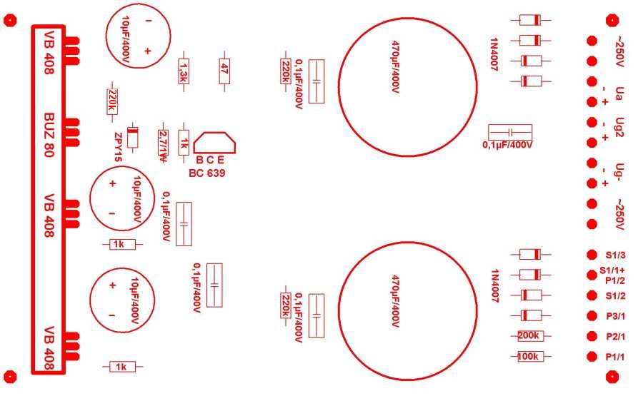 anderen Poti's in der restlichen Schaltung. Regelung 2 : Diese dient der Einstellung der Ug2 und ist im Bereich von 0 - 220V einstellbar. Die Belastbarkeit beträgt 40 mA. Regelung 3 : Regelung 3 ist unbedingt aus einer separaten Trafowicklung zu versorgen. Sie liefert -Ug1 im Bereich von 0 -220V mit maximal 40mA. <>Die Platine ist eine normale 100 x 160 mm große Europaplatine. Das IC VB408 ist leider abgekündigt worden.![]() Viel Spaß beim nachbauen. |