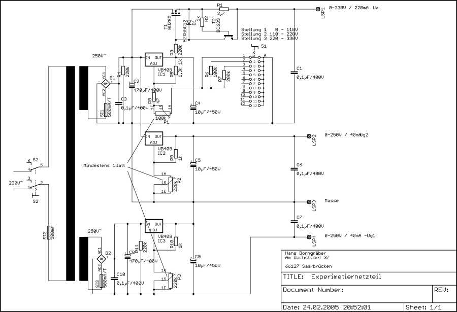 Technische Daten : Ua 0 - 330V 220mA Kurzschlussfest -Ug1 0 - 220V 40 mA Kurzschlussfest Ug2 0 - 220V 40mA Kurzschlussfest Heutige Labornetzteile liefern nur in Ausnahmefällen die für Röhrenschaltungen notwendigen hohen Spannungen. Die nachfolgend vorgestellte Schaltung liefert diese ohne großen technischen Aufwand in guter und stabiler Qualität. Das Netzteil besteht aus drei einzelnen Regelungen die über zwei getrennte Trafowicklungen versorgt werden. Regelung 1 : Die erste Regelung dient der Erzeugung der Anodenspannung Ua. Der Längsregler VB408 wird mit einem Power Mosfet "aufgemotzt" und bringt dann 330V 220mA. Die Regelung ist über einen Stufenschalter in drei Bereiche aufgeteilt 0V-110V / 110V-220V / 220V-330V dies erleichtert die Einstellung der Spannungen. Aufgrund der vielen