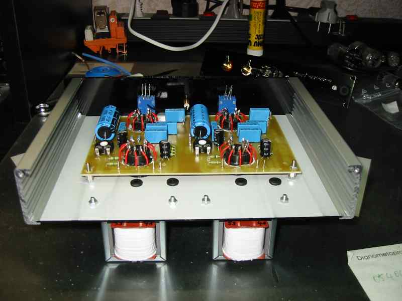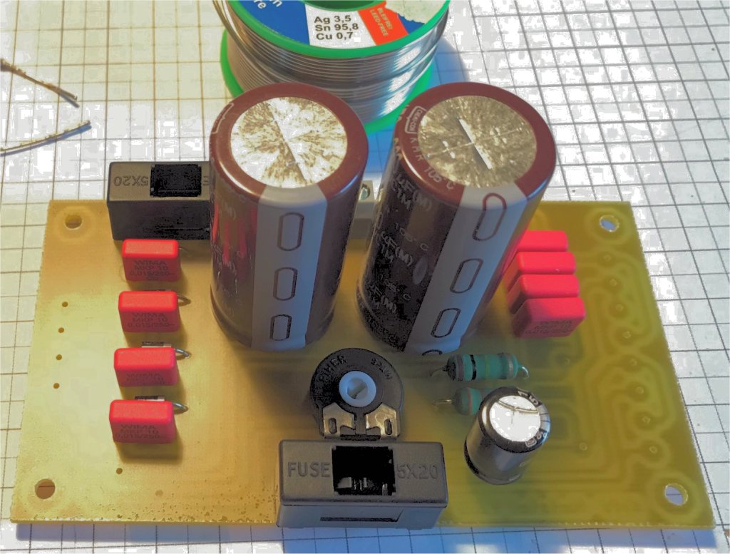 Das Netzteil Das Netzteil besteht aus einem Trafo mit 160V / 120mA Wicklung und 6,3V /1,3A Wicklung. Um das ganze kompakt zu halten habe ich eine Halbleitergleichrichtung verwendet. Die Siebung erfolgt mit einem CLC Siebglied mit parallel Resonanz Filter für die 100Hz. Dies ergibt einen Brumm von 0,02mV bei Vollast des Netzteils. Das Gehäuse Gehäusebau ist nach dem wickeln von Spulen bei mir die zweitunbeliebste Bastelbeschäftigung :-). Also bin ich immer auf der Suche nach einfachen Lösungen. Bei dem hier verwendeten Gehäuse handelt es sich um ein Aluprofilgehäuse der Firma ISEL. Dieses Gehäuse ist normalerweise für Europakarten gedacht 100x160mm, das wäre für die Schaltung aber zu klein. Also bin ich hingegangen und habe es durch die Anfertigung neuer Aluplatten auf 200x160mm vergrößert. Mit einer Kreissäge und einer 1,5mm starken Aluplatte war das kein Problem. Die neuen Platten wurden dann gebohrt, geschliffen und mit Grundierungslack grundiert. Anschließend wurde mit schwarzem hochglänzendem Autolack das Endfinish hergestellt. Fertig war das Gehäuse. Folgende Aluzuschnitte wurden hergestellt : 2 x