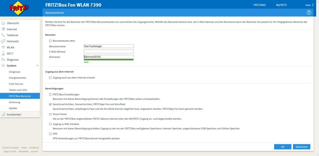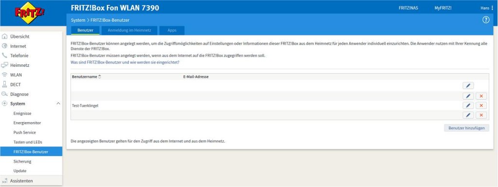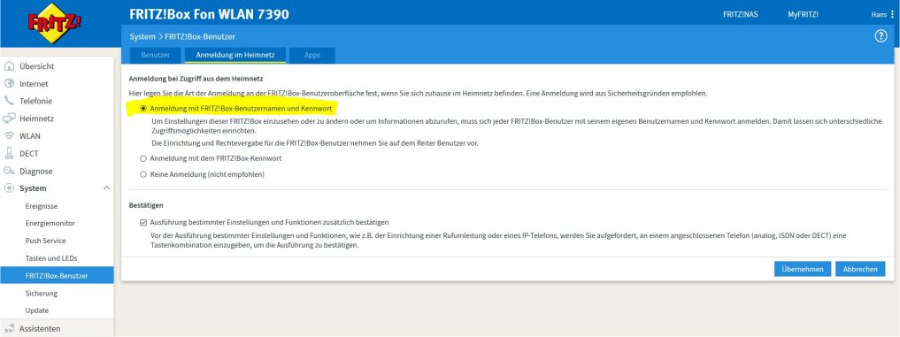 Aktion: System -> FRITZ!Box-Benutzer -> Anmeldung am Heimnetz