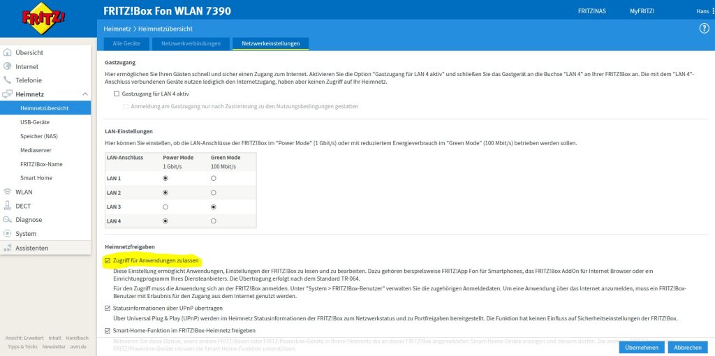Den Haken bei „Zugriff für Anwendungen zulassen“ setzen. Anschließend muss die Fritzbox gebootet werden.