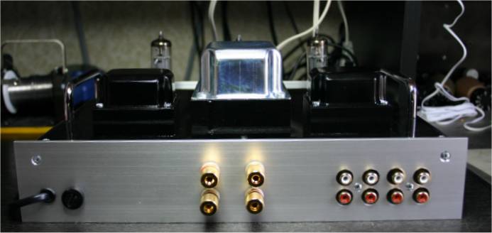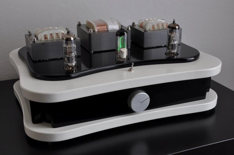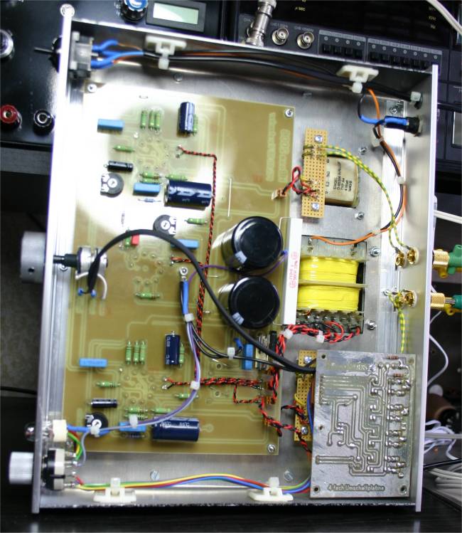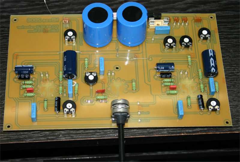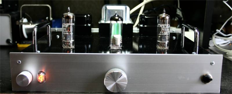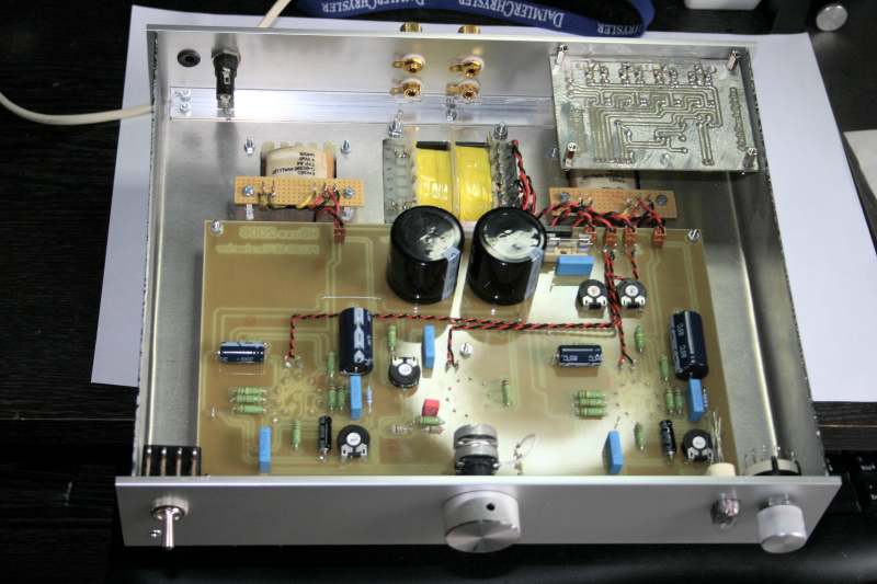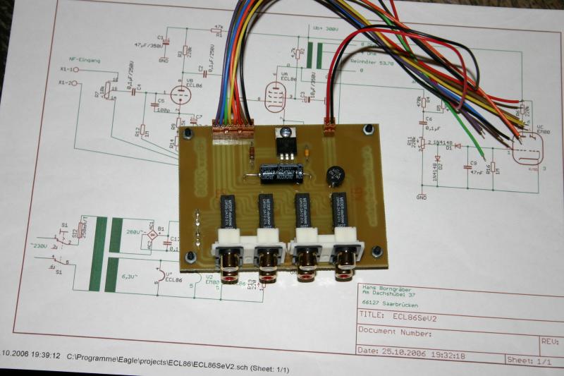 für beide Stereokanäle entworfen. Netzteil Das Netzteil ist ein klassisches Netzteil für Röhrenverstärker mit Halbleiter Gleichrichtung und CRC Siebkette. Der Längswiderstand ist absichtlich stark überdimensioniert mit 11Watt, aber das beschert ihm ein langes Leben. Der Netztrafo stammt von Jan Wüsten. Hierbei handelt es sich um den TRA201. Eingangkanalwähler Der Verstärker verfügt über 4 Eingangskanäle die Relais gesteuert umgeschaltet werden können. Welcher Kanal aktiv ist wird stilecht mit einer Mini-Nixie angezeigt, die über eine zweite Schalterebene am Kanalwähler angesteuert wird. Inaktive Eingänge werden gegen Masse kurzgeschloßen. Verstärker Die Schaltung des SE Verstärker weist keine Besonderheiten auf. Mit 37mA ist der Anodenstrom genau nach Datenblatt eingestellt. Die beiden Potis helfen bei Exemplarstreuungen der Röhren den richtigen Strom einzustellen. Einfach -5V einstellen gemessen mit einem Digitalvoltmeter zwischen Kathode und G1 der Pentode. Der Ausgangsübertrager sollte einen Ra von 5,2k haben. Mögliche Lieferanten sind HSGM Engel A4, Gerd Reinhöfer 53.62P oder Hammond 125ASE. Aussteuerungsanzeige Die beiden Ausgangssignale werden über hochohmige Widerstände gemischt, dann mit zwei Germanium Dioden gleichgerichtet. Mit dem Pegelsteller kann der maximal Pegel eingestellt werden. Platinen Der Eingangswahlschalter beinhaltet alle Bauteile die für die Umschaltung notwendig sind. Mit einer Größe von 75x100 mm ist sie sehr kompakt. Ein gutes Stück größer ist die Verstärkerplatine mit ihren 150x250 mm dafür beinhaltet sie alles was für den Verstärkeraufbau benötigt wird. Es müssen nur die Trafos angeschloßen werden. Das verhindert absolut den Ärger den die Röhre (PCL86) manchmal macht und damit gestaltet sich der Aufbau auch für Anfänger völlig gefahrlos. Wie auf den Fotos zu sehen ist ist die Heizungsverdrahtung extern ausgeführt. Leiterbahnen auf Platinen lassen sich so schlecht verdrillen :-). Gehäuse Das Gehäuse ist komplett aus Baumarktteilen gefertig. Die Aluplatte wurde mit Autolack grundiert und lackiert. Die eloxierten Fronten sind komplett unbehandelt. Sehr schwierig gestaltete sich der Einbau IN17 in die 4mm Frontplatte. Da war feilen angesagt. ![]() Viel Spaß beim nachbauen. Salu Hans Borngräber |